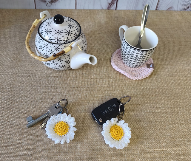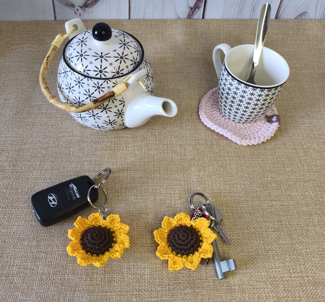 Ces porte-clés sont réalisés au crochet avec un fil 100% coton mercerisé , avec un coeur marron et des pétales jaune soleil.